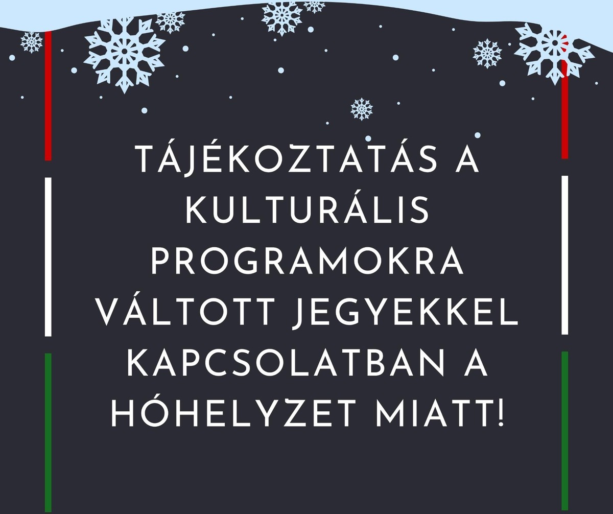 A rendkívüli téli időjárásra és a több térséget érintő hóhelyzetre tekintettel a Kulturális és Innovációs Minisztérium felhívja a figyelmet arra, hogy - az előadó-művészeti szervezetek által korábban is bevett gyakorlatnak megfelelően - akik a kulturális intézmények valamely programjára váltottak jegyet, de a körülmények miatt nem tudnak részt venni az adott rendezvényen, forduljanak bizalommal az érintett kulturális intézményekhez és szervezőkhöz.