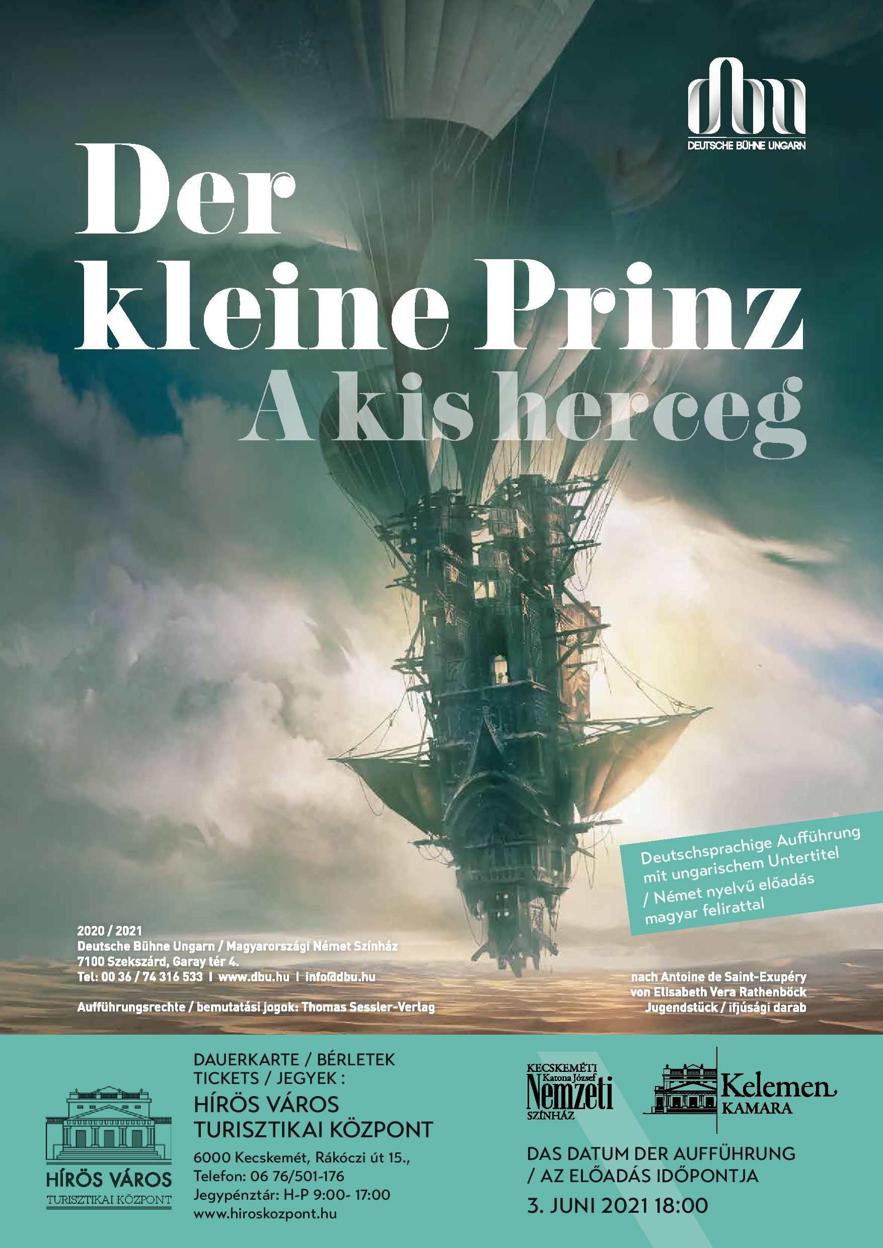 A Magyarországi Német Színház újabb előadással örvendezteti meg a kecskeméti közönséget a Hírös Város Turisztikai Központban, a Kecskeméti Katona József Nemzeti Színház Kelemen László Kamaraszínházában. A Deutsche Bühne Ungarn nem ismeretlen a színházrajongók körében, hiszen országszerte teltházzal játszanak.  2020 őszén a pandémia miatt sajnos csak egy előadásukat tudtuk színpadra állítani (A szőlőtőkék Istene). A novemberben elmaradt Dekameron helyett ezúttal egy igazi közönségkedvenc produkcióval érkeznek hozzánk; Antoine de Saint-Exupéry: A kis herceg című remekművével. A korábban megváltott jegyek és bérletek automatikusan érvényesek az új előadásra, mely ezúttal is német nyelven, magyar nyelvű felirattal lesz látható.