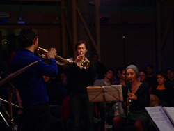 Szombat este van és ezúttal ingyenes a Krétakör SzínészTáncZenekar bemutató órája, úgyhogy el is várja az ember, hogy megteljen a Gödör Klub hátsó terme. Végül a nyolcas kezdés kicsit korainak bizonyul, hiszen a jó másfél órásra nyúló örömzene utolsó harminc percében mondhatjuk csak el, hogy egy tűt sem lehet leejteni - ekkor már vagy kétszázan lehetünk. Eleinte vagy hatvan-nyolcvan embernek játszik a nagy körben elhelyezkedő zenekar (Bánki Gergely - dob, Katona László - basszusgitár, Láng Annamária - klarinét, Péterfy Borbála - tangóharmonika, Sárosdi Lilla - trombita, Tóth Attila - szintetizátor, Werner Tilo - gitár) és a kör közepén királykék trikóban trombitáló Bozsóki Imre tanár úr, az est házigazdája. Bevezetésül elmondja, hogy az elmúlt öt napban elsősorban az elméleti továbbképzés illetve különféle ritmus- illetve stílusgyakorlatok álltak az órák középpontjában, s az este folyamán ezekből mutat be néhányat a zenekar. Az első szám a Columbo on Fifth Avenue nevet viseli, s a ma szokásos dúr- és mollhangnemektől eltérő rendszerű, a dór, a líd, a fríg, a lokriszi és a mixolíd egyházi skálák tanulmányozására szolgált. A fúvósvonalra épülő, párhuzamos kvartokkal dolgozó, leginkább a modális jazz műfajába sorolható, Miles Davies Kind of Blue-jára hajazó számot aztán a Tanár Úr mindjárt az elején újra indítja, ezzel feloldva zenészeit a megfelelés kényszere alól - most már ez is csak olyan óra, mint a többi, lehet hibázni, majd kijavítják. Mo's Groove-ként aposztrofálja aztán a második számot - bár rögtön megjegyzi, hogy a legnehezebb feladat egy számnak nevet adni -, melyet Moritz nevű barátjával komponált még valamikor régen. Ez a mű tehát nem helyben született, fő eleme egy basszus figura, a ritmikai nehézséget pedig az adja, hogy az 1-ek mindig ki vannak hagyva belőle. Ha műfaját kéne meghatározni, leginkább a hatvanas-hetvenes évek funkyjához hasonlítaná. A nem túl barátságos címet viselő Führerbunker számot "próbatermünknek szenteltük" - magyarázza a zeneszerző, alighanem a Nemzeti Gödör betonfalaira utalva. Nekem pedig eszembe jut a kísértetiesen hasonló londoni Barbican, Európa egyik legnagyobb kulturális központja, melyről tudom, hogy a hidegháborúban az angolok első számú atombunkeréül szolgált, noha erről az odajáróknak többnyire sejtelmük sem volt. A Führerbunker balkáni skálára, balkáni, 7/8-os ritmusban íródott - gyengébbeknek szóló megfogalmazásban "nehéz rá tapsolni". Alighogy elkezdik, Bozsóki Tanár Úr már le is állítja, markánsabb belépésre és bátrabb játékra buzdítva zenészeit. Péterfy növendék nem átall visszafeleselni: "azt mondtad, hogy halkan játsszuk", de meg is kapja rá a választ: "halkan, de határozottan". A középrészben aztán egy ritmusváltást csak harmadik rászámolásra sikerül elkezdeni, majd újabb szünet következik: "hé, nekem is van szólóm!", a két trombitás leáll vitatkozni, "ez már kezd kínos lenni" - de a szemmel láthatólag nehéz feladat megoldását a végén aztán még dörgőbb tapssal jutalmazza a közönség.Ezután két magyar népdal sajátos feldolgozása következik: először a Tavaszi szél vizet áraszt 7/8-os ütemváltozatát hallhatjuk - a ritmusszekció kibővül: Tilo kolompol, Gergőt reszelőt teker és csörgőkarikázik, Bori tikfára vált, ha jól látom, de sajnos ő nekem háttal ül, úgyhogy nem lehetek biztos a dolgomban. Jópofa szám kerekedik a jól ismert népdalból, melyet talán ma is elsőként tanul meg az ember az óvodában. "Az ötlet bevált - meséli a mester - , vérszemet kaptunk, de a következő próbálkozásba belebuktunk, ezt is megmutatjuk." A "Ha felmegyek a budai nagy hegyre" kezdetű nótának kéne itt megszólalnia, de már a dallamot se sikerül eltalálni, újra a Tavaszi szélbe fog valaki - aztán mégis végigjátsszák a másik népdalt is, "hadd fájjon". Egy kis cím nélküli swing után az utolsó számot konferálja fel az est moderátora, s mivel tudja, hogy a Krétakörben szokás megadni a lehetőséget a közönségnek, hogy kérdezzen, e helyütt erre is lehetőséget kínál. Veress Panka dramaturg megkéri, hogy meséljen magáról valamit, hiszen a jelenlévők talán nem ismerik. Bozsóki Imre engedelmesen beszámol vajdasági születéséről, a grazi jazzegyetem szakról, mely elvben hat évig tart, ám amelyet ő három év után otthagy: "hat éves egyetem - ez nem normális dolog" és megosztja velünk legfontosabb linkjeit, a honlapja címét a http://www.myspace.com/imrelb -t és azt a helyet, ahonnan lemeze letölthető: (http://www.phonector.com/music.php?alb=100227&style= ). S miután kielégítette kíváncsiságunkat, beinti az utolsó jazzszámot is.