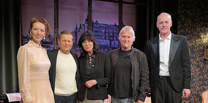 A fotókon - háttérben az előadás stockholmi látképe - Krausz Ferenccel A Díj szereplői, Kiss Mari, Seress Zoltán, Szorcsik Kriszta és a rendező, Herendi Gábor.