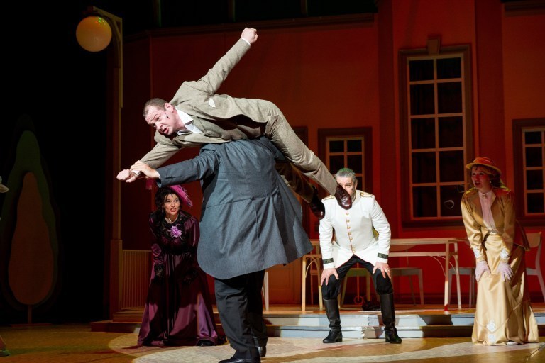 A színrevitel másik erénye, hogy tartózkodik, és távol tart minden színészt az elhamarkodottságtól. Aldobolyi professzionális zenedramaturg. Az első jelenetekben Péter Attila Zsolt (Jack Topplebee, oxfordi diák) és Gaál Gyula (Charley Wykeham, oxfordi diák) ingatag lelkű szerelmesként téblábolnak a színpadon: lenn van az előadás, amiként a hősök is, maguk alatt. Fordulat a haditerv végrehajtására szövetkezés tercettje, roppant erős mozgáskísérettel. A koreográfusok, Bordás Attila és Gabriela Tănase kihasználják a színészek összes tánc- és akrobatikus képességét, precízen beosztják energiájukat, s megadják az énekes tánchoz elengedhetetlen légzésszüneteket. Ami közben fergeteges az iram a szerep szerinti ifjak számára, azonközben dallamhoz igazodóan lágyak a mozdulatok ott, ahol nincs helye a vehemenciának.